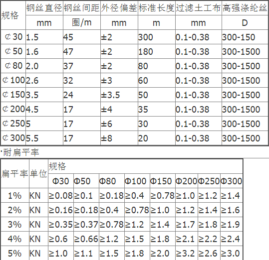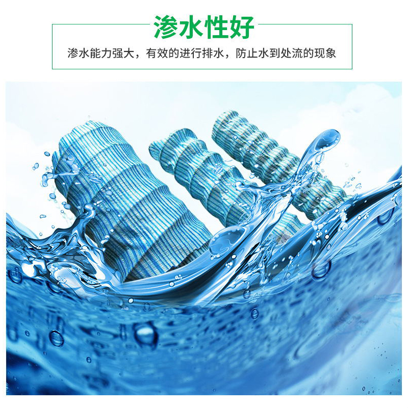 透水管是以防銹彈簧圈支撐管體,形成高抗壓軟式結(jié)構(gòu),無紡布內(nèi)襯過濾,使泥砂雜質(zhì)不能進入管內(nèi),從而達到凈滲水的功能。滌綸絲外繞祉覆層具有優(yōu)良吸水性,能迅速收集土體中多余水份。橡膠筋使管壁被覆層與彈簧鋼圈管體成為有機一體,具有很好的全方位透水功能,滲透水順利滲入管內(nèi),而泥砂雜質(zhì)被阻擋在管外,從而達到透水、過濾、排水之目的。