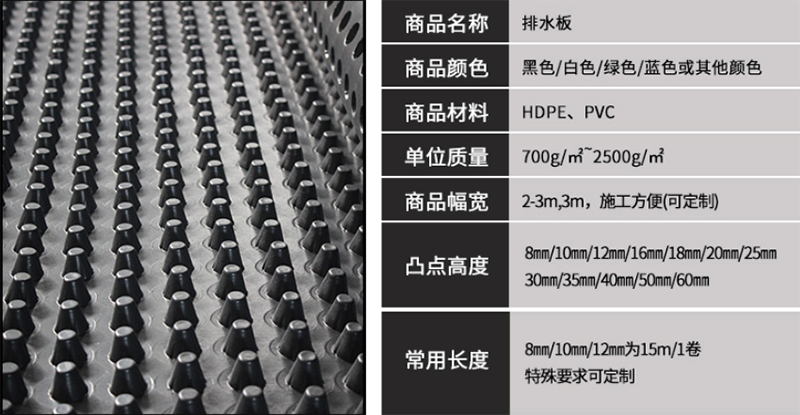 1、導(dǎo)水排水性。2、防水性能。3、排水板保護(hù)防護(hù)性。4、隔音及通風(fēng)防潮功能。